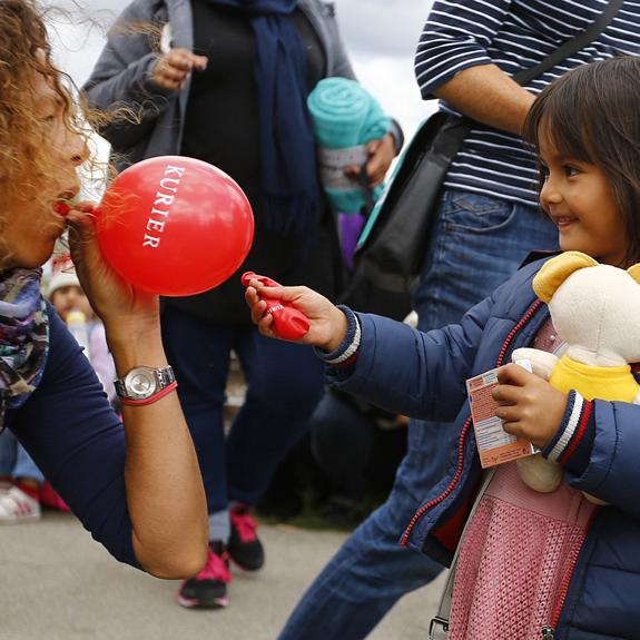 A volunteer gives a balloon to a migrant child at the railway station in Nickelsdorf,Austria September 6, 2015. REUTERS/Leonhard Foeger