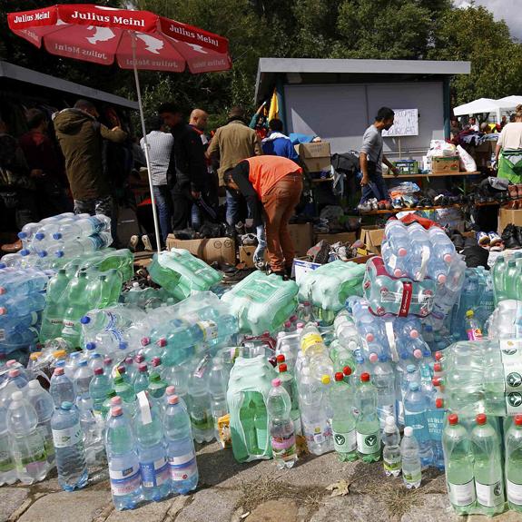 Volunteers prepare water and supplies for distribution to migrants at the Austrian railway station of Nickelsdorf September 6, 2015. REUTERS/Leonhard Foeger