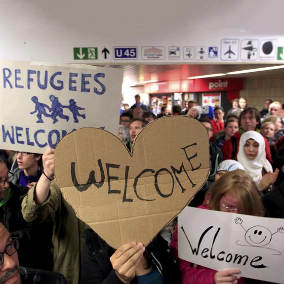 Well Wishers wave to migrants arriving at the main railway station in Dortmund, Germany September 6, 2015. REUTERS/Ina Fassbender