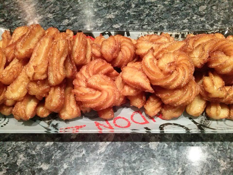 Ανακατέψτε το αλεύρι, το αλάτι, το σιμιγδάλι. Βάλτε το νερό, τη ζάχαρη και το λίπος σε μια μικρή βαθιά κατσαρόλα επάνω σε δυνατή φωτιά. Μόλις αρχίσει να βράζει δυνατά, σβήστε τη φωτιά και αφήστε την κατσαρόλα επάνω σ’ αυτή. Ρίξτε μεμιάς το αλεύρι και ανακατέψτε γρήγορα μ’ ένα ξύλινο κουτάλι, έως ότου γίνει ζύμη σφιχτή, που θα ξεχωρίσει από τα τοιχώματα της κατσαρόλας και θα μαζευτεί σαν μπάλα γύρω από το κουτάλι. Αδειάστε τη ζύμη στο μπολ του μίξερ κι αφήστε τη, να κρυώσει 8′-10′. Στο διάστημα αυτό, ετοιμάστε το σιρόπι. Ανακατέψτε σε μια κατσαρόλα τα υλικά και βράστε τα 5′. Αφήστε το σιρόπι να κρυώσει. Χτυπήστε τη ζύμη με το γάντζο ζυμώματος και ρίξτε μέσα ένα-ένα τ’ αυγά. Αφήστε κάθε αυγό να ενσωματωθεί καλά με τη ζύμη, πριν ρίξετε το επόμενο. Ρίξτε τόσα αυγά, όσα χρειάζονται, για να γίνει μια ζύμη απαλή και γυαλιστερή, που να μην τρέχει. Σε μια πλατιά και βαθιά κατσαρόλα με χοντρό πάτο ή σε φριτέζα, κάψτε μπόλικο λάδι (μισό ελαιόλαδο, μισό καλαμποκέλαιο). Βάλτε τη ζύμη σε σακούλα με χοντρή μύτη σε σχήμα αστεριού και άνοιγμα 1 εκ. Πιέζοντας τη σακούλα, κόψτε με υγρό μαχαίρι κορδόνια ζύμης με μήκος 5 εκ. μέσα στο καυτό λάδι. Βάλτε τόσα, όσα χωράει η κατσαρόλα και πατώντας τα με τρυπητή κουτάλα, ώστε να καλύπτονται από το λάδι, αφήστε τα να ροδοψηθούν ολοτρόγυρα. Βγάλτε τα με τρυπητή κουτάλα κι ακουμπήστε τα σε απορροφητικό χαρτί, να φύγει η περίσσεια του λαδιού. Ρίξτε τα κατόπιν στο σιρόπι, αφήστε τα 5′ και ύστερα βγάλτε τα σε πιατέλα. Πασπαλίστε τα με καρύδια. Επαναλάβετε την ίδια διαδικασία, έως ότου τελειώσει η ζύμη. Σερβίρετέ τα την ίδια ημέρα. ΄Οσα περισσέψουν, φυλάξτε τα στο ψυγείο σκεπασμένα με πλαστική μεμβράνη.