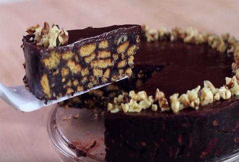 Για το σιρόπι σοκολάτας, βάζετε σε ένα τηγάνι λίγη ζάχαρη καθώς και την σκόνη κακάο. Καθώς ανακατεύτε το μείγμα, χύνετε λίγο νεράκι ώστε να «δέσουν» τα δύο υλικά. Αφού ρίξετε και το βούτυρο, τοποθετήστε το τηγάνι σε μέτρια φωτιά. Αφήστε το να βράσει για περίπου 7-8 λεπτά ανακατεύοντας συνεχώς το μείγμα. Όταν το βγάλετε από τη φωτιά, προσθέστε το εκχύλισμα βανίλιας και αφήστε το να κρυώσει για περίπου 10-15 λεπτά. Κατόπιν, ρίχνετε το σιρόπι στο μπολ με τα μπισκότα και τα καρύδια και τα ανακατεύετε καλά με ένα μεγάλο κουτάλι.Όταν τελειώσετε αυτή τη διαδικασία, βάζετε το μείγμα σε ένα μεγάλο στρογγυλό πιρέξ, όπου με μια σπάτουλα το απλώνετε ομοιόμορφα. Μέχρι να ετοιμάσετε την σοκολάτα γκανάς, τοποθετείτε το πυρέξ στο ψυγείο για περίπου 30 λεπτά – 1 ώρα.Για να την σοκολάτα ganache τοπεθετείτε την κρέμα γάλακτος σε ένα μικρό τηγάνι μέχρι να πάρει βράση. Στη συνέχεια, ρίχνετε την κρέμα πάνω από το μπολ με τα κομμάτια σοκολάτας και την αφήνετε για ένα 1 λεπτό. Ύστερα, ανακατέψτε καλά μέχρι να δημιουργηθεί ένα σοκολατένιο μείγμα.Μετά, περιχύνετε την σοκολάτα ganache πάνω από την τούρτα μπισκότο και τη βάζετε ξανά στο ψυγείο να πήξει για περίπου 3-4 ώρες πριν την σερβίρετε. Τέλος, όταν βγάλετε την τούρτα από το ψυγείο, μπορείτε να την διακοσμήσετε με λίγα ψημένα καρύδια.