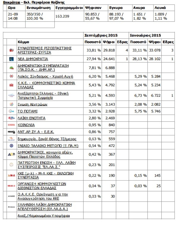 ΥΠ.ΕΣ.: Τα τελικά αποτελέσματα στο 100% των Ε.Τ. ΠΕ Κοζάνης και το 99,97 % Επικράτειας