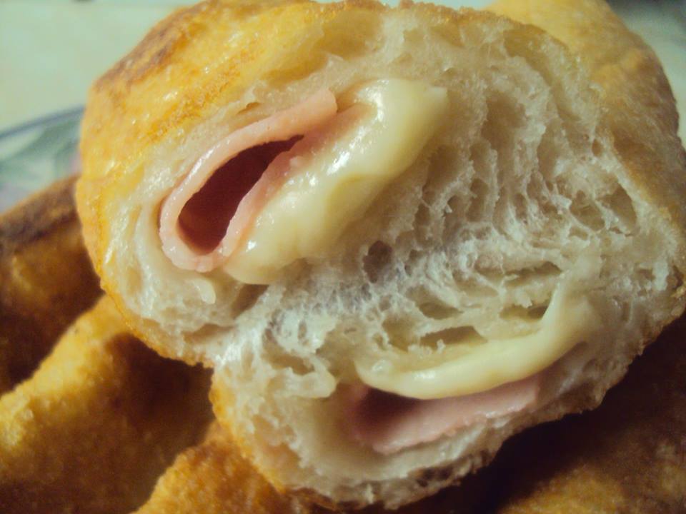 Ανοίγω λίγο λίγο από την φουσκωμένη ζύμη που την άφησα κάνα 3ωρω να γίνει μαζί με τα ψωμιά…ανοίγω λοιπόν ένα στενόμακρο ζυμαράκι βάζω μέσα μια φέτα ζαμπόν κομμένο στα 2 και 1 φέτα γκούντα κομμένη και αυτή και βρέχω τις άκρες για να μην ξεκολλήσει…και το γυρνάω κάνοντας το σχήμα της φλογέρας…τηγανίζω σε μέτρια έως λίγο δυνατή φωτιά και από τις 2 πλευρές!!