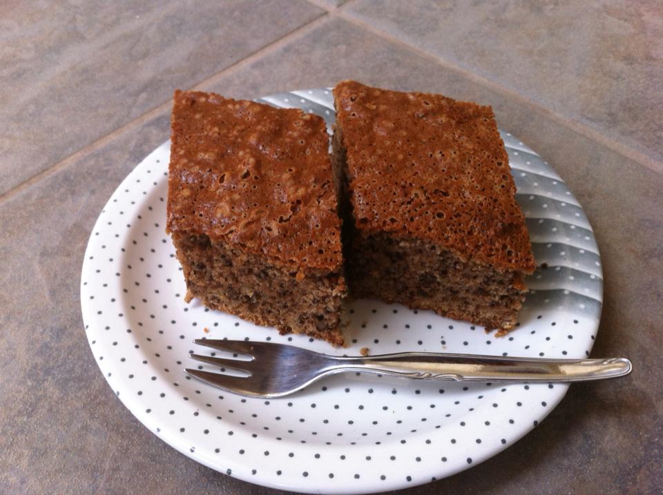– Βγάζουμε την Καρυδόπιττα Μας σε μεγάλο δίσκο ή ταψί να κρυώσει και μόνο τώρα αφαιρούμε κομμάτι.