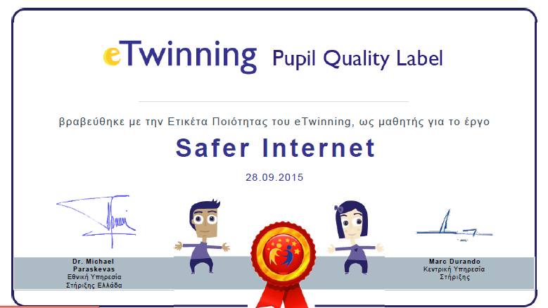 Το έργο μας «Safer Internet» (Ασφαλέστερο Διαδίκτυο) βραβεύτηκε με ΕΤΙΚΕΤΑ ΠΟΙΟΤΗΤΑΣ ως έργο etwinning το 2015!