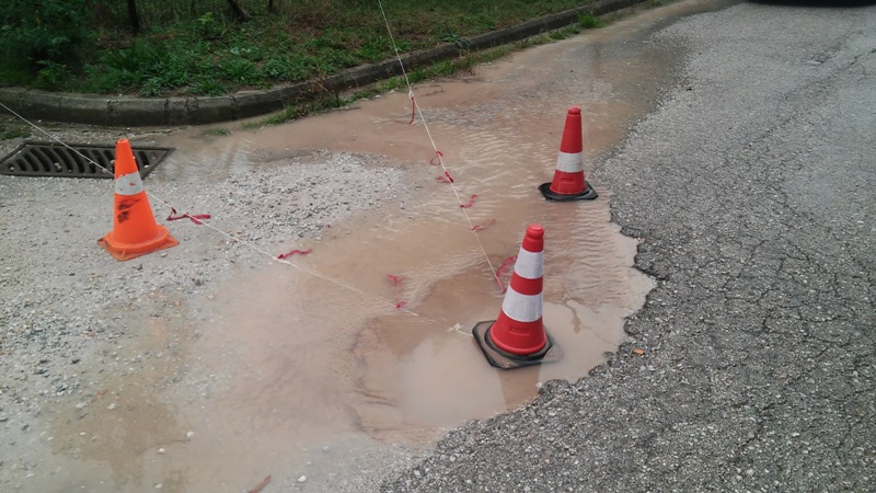 Σήμερα Σάββατο 10/10, το χαλίκι από το “προσωρινό” μπάλωμα της λακκούβας υποχώρησε από το νερό της βροχής. Αποτέλεσμα ήταν μια λακκούβα με βάθος πάνω από 30 εκατοστά, από την οποία ρέουν ασταμάτητα μεγάλες ποσότητες νερού.