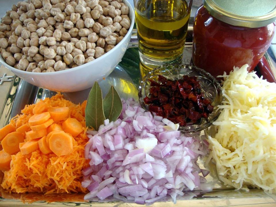 καθαρίζουμε πλένουμε και μουσκεύουμε σε ζεστό νερό τα ρεβίθια μας από το προηγούμενο βράδυ!!! το πρωί τα σουρώνουμε βάζουμε καθαρό νερό στην κατσαρόλα και τα βράζουμε μέχρι να αρχίσουν να μαλακώνουν, αν θέλετε τα βάζετε στην χύτρα 15 με 20 λεπτάκια! όταν είναι έτοιμα βάζουμε όλα τα υλικά στην γάστρα εκτός από το αλατι που το βάζετε την τελευταία ωρίτσα,