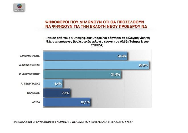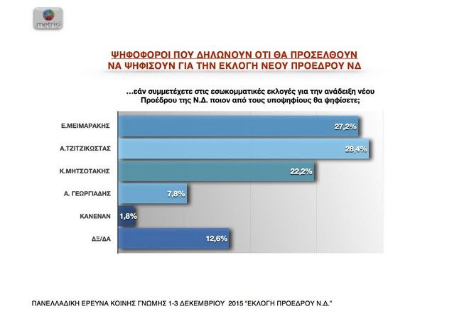 Ο κ. Τζιτζικώστας συγκεντρώνει το 28,7%, ο Βαγγέλης Μεϊμαράκης το 24,4%, ο Κυριάκος Μητσοτάκης 21,7% και ο Άδωνις Γεωργιάδης το 6,1%.