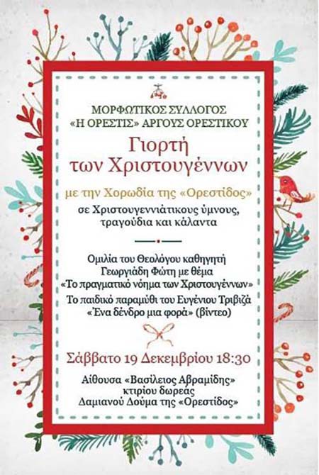 Ο Μορφωτικός Σύλλογος ‘Η Ορεστίς’ Άργους Ορεστικού διοργανώνει τη ‘Γιορτή των Χριστουγέννων’ το Σάββατο 19 Δεκεμβρίου και ώρα 18.30.