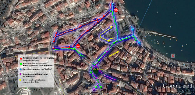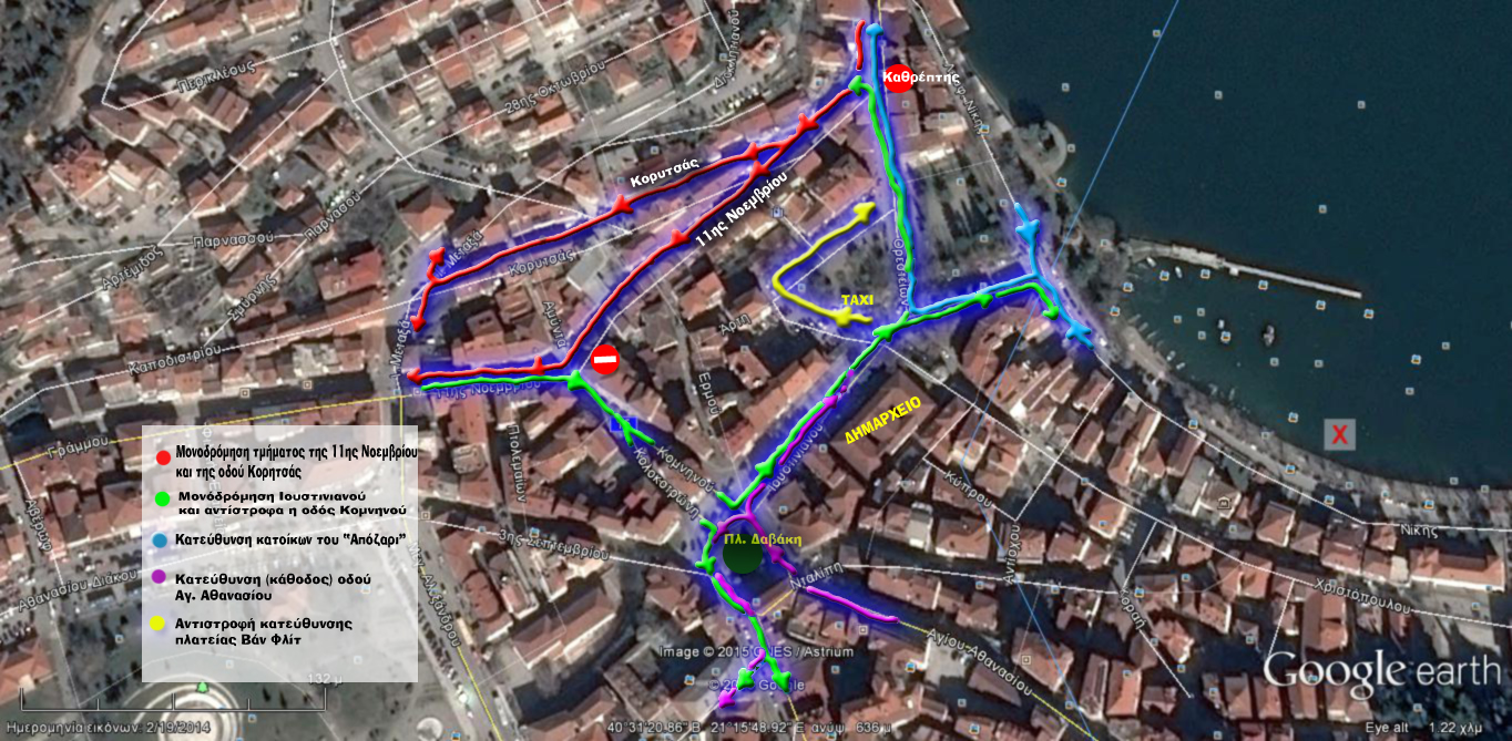 Οι αλλαγές που προτείνουμε: Κρατάμε την φορά της οδού Κολοκοτρώνη ως έχει και αντιστρέφουμε την φορά της οδού Κομνηνού προς την πλατεία Δαβάκη. Και οι δύο δρόμοι της “διχάλας” δηλαδή γίνονται ανηφόρες. Παράλληλα μονοδρομούμε την οδό Ιουστινιανού μόνο προς την Βόρεια Παραλία. Και τα δύο ρεύματα δηλαδή της Ιουστινιανού (που περνά μπροστά από το Δημαρχείο) γίνονται κατηφόρα. Όλη η διαδρομή που προτείνουμε σκιαγραφείται στον χάρτη με πράσινο χρώμα.Δημιουργώντας τις δύο ανηφόρες, “σπάμε” την κίνηση στην πλατεία Δαβάκη και επιταχύνουμε την κίνηση προς Χλόη. Οι ολιγόλεπτες στάσεις στα καταστήματα και το Δημαρχείο μπορούν τώρα να επιτραπούν ελεύθερα (όχι όμως το μόνιμο parking που θα στερούσε μια λωρίδα κυκλοφορίας). Ο δρόμος μπορεί να “σηκώσει” μεγαλύτερο φόρτο οχημάτων προς Χλόη αφήνοντας και το περιθώριο για στάσεις στα καταστήματα (ακόμα και των προμηθευτών) χωρίς να παρακωλύεται έντονα η κυκλοφορία και με μεγαλύτερη ασφάλεια για οχήματα και πεζούς (μιας και έχουμε μια κατεύθυνση και στις δυο λωρίδες του δρόμου, προς τα κάτω).