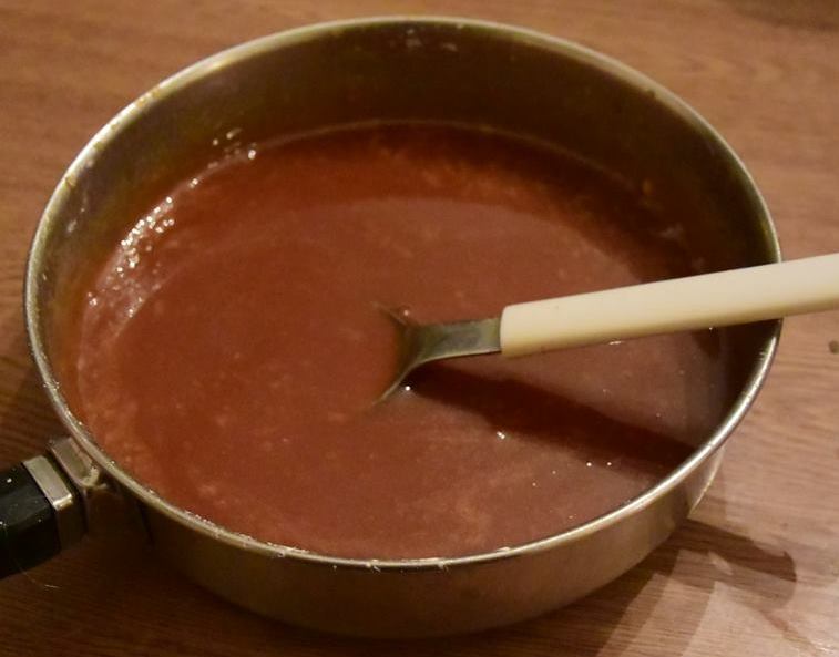 Βάζουμε σε μικρό κατσαρολάκι τη ζάχαρη σταδιακά, κουταλιά- κουταλιά, περιμένοντας κάθε φορά να λιώσει για να προσθέσουμε και άλλη, μέχρι να πάρει το χρώμα της καραμέλας ανακατεύοντας συνεχώς.