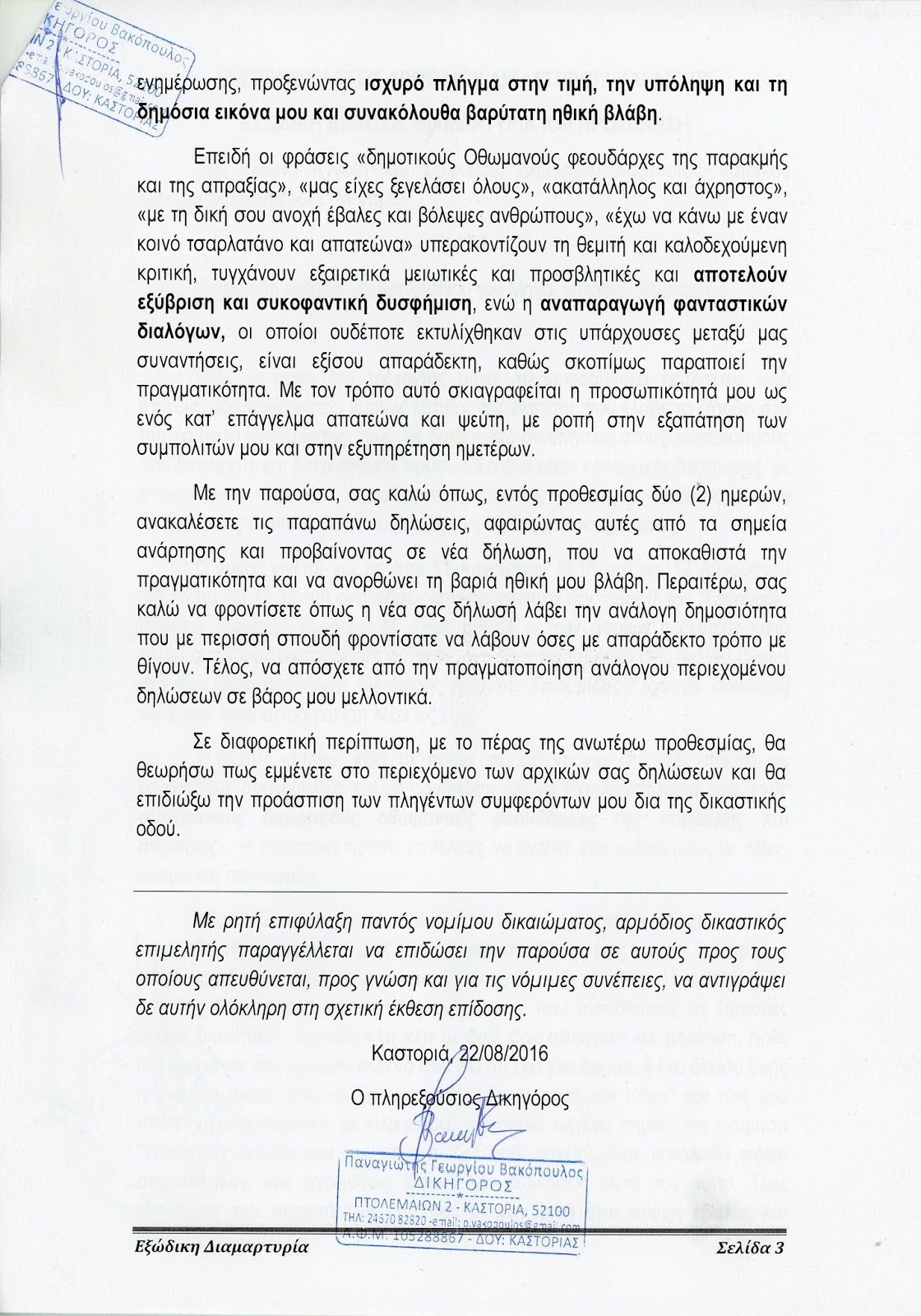 Την Τρίτη 30 Αυγούστου 2016, κατέθεσα ΚΑΤΑΓΓΕΛΙΑ προς γνώση του Δημοτικού Συμβουλίου και της Δημοτικής Κοινότητας του Δήμου Καστορίας, σχετικά με την απρεπή και αντιδεολογική συμπεριφορά του Δημάρχου του Δήμου Καστοριάς κ. Ανέστη Αγγελή, να επιλύσει τις προσωπικές του διαφορές μαζί μου οικειοποιούμενος την θεσμική του ιδιότητα μέσα από προσωπική του εξώδικη δήλωση που μου απέστειλε στις 22/08/2016, ότι αριθμός σχολίων-αναρτήσεων που δημοσίευσα στον προσωπικό μου λογαριασμό και σελίδα στο μέσο κοινωνικής δικτύωσης Facebook, δήθεν τον φωτογράφιζαν και τον έθιγαν προσωπικά με συκοφαντική και δυσφημιστική διάθεση. Δεν νοείται ένας αιρετός, ο οποίος φέρει την ιδιότητα του δημάρχου με σκοπό την διασφάλιση, διατήρηση και προάσπιση των συμφερόντων του Δήμου Καστοριάς να χρησιμοποιεί και να οικειοποιείται την θεσμική του θέση για την επίλυση των προσωπικών του προβλημάτων, πόσο μάλλον δε όταν ο ίδιος αυτεπάγγελτα πράττει εν αγνοία του Δημοτικού Συμβουλίου, που είναι και το ανώτατο όργανο του Δήμου για να εξουσιοδοτεί δικαστικές και εξωδικαστικές αξιώσεις.