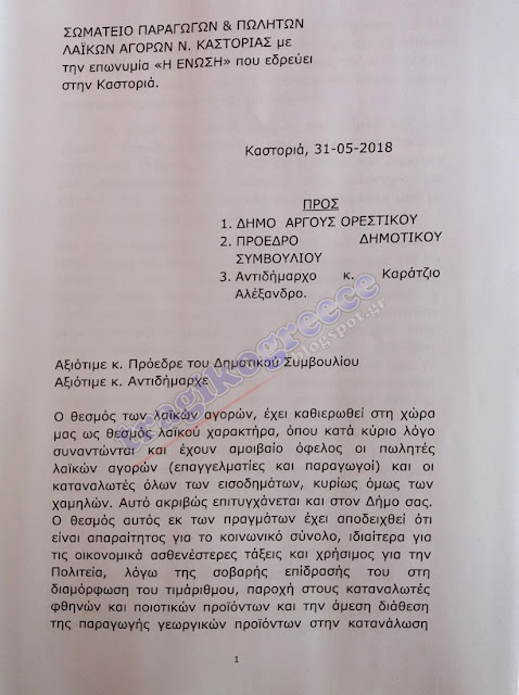 Δείτε την εξασέλιδη επιστολή που έδωσε σήμερα στο Δήμο Άργους Ορεστικού το Σωματείο Παραγωγών & Πωλητών Λαϊκών Αγορών Ν. Καστοριάς για την αλλαγή τοποθεσίας της λαϊκής αγοράς και βίντεο με τις δηλώσεις του προέδρου του Σωματείου Παραγωγών και Πωλητών λαϊκών αγορών Καστοριάς.