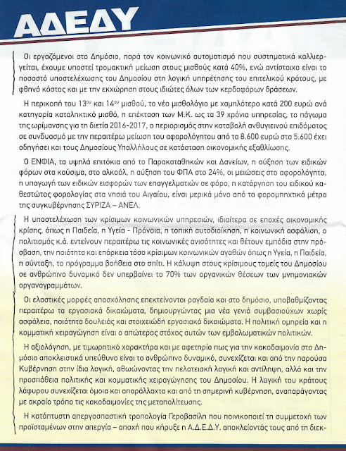 Ακολουθεί η μπροσούρα της ΑΔΕΔΥ, απ’ όπου αναγνώστηκαν οι περισσότερο πολιτικές θέσεις των οργανωτών της απεργίας.