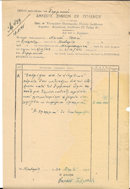 [στο ίδιο σημειώνεται]: Παρελήφθη σήμερον παρ’ εμού του κ. Μωΐς Σ. Μάτσα ο ανωτέρω υπ’ αριθ. 3857095/212,6 γνώμων ιδιοκτησίας μου. Εν Καστορία τη 22/9/45, ο παραλαβών, υπογραφή [Μ. Μάτσας]