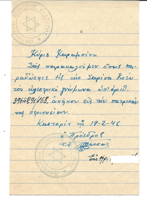 Επιτρέπομεν εις την Δεσποινίδα Σουλίκα θυγατέρα Μποχώρ Ιωσήφ Κοέν κάτοικον Καστορίας όπως παραλάβη εκ του καταστήματος Μιχαήλ Ζ…, τον υπ’ αριθ. 42516/187 ηλεκτρικόν γνώμονα καθ’ υπόδειξιν της ενταύθα υπηρεσίας ηλεκτρικής εγκαταστάσεως, άτε ανήκοντος εις τον αγνώστου διαμονής Μποχώρ Ιωσήφ Κοέν. Εν Καστορία τη 7-11-1945, υπογραφή, σφραγίδα της υπηρεσίας