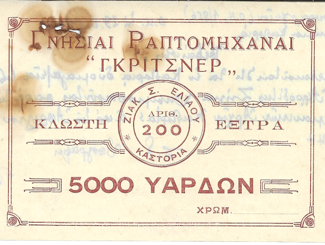 Παρακαλούμεν όπως παραδόσητε τον υπ’ αριθ. 3857095/175 ηλεκτρικόν γνώμονα ιδιοκτησίας Σολομών Μάτσα αφού ανταλλαγή η κεκανονισμένη απόδειξις αποδόσεως και παραλαβής. Καστορία 1-9-45, ο Οικον. Έφορος, υπογραφή, σφραγίδα της υπηρεσίας