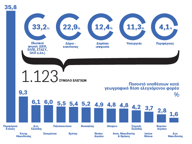 - Επιθεωρητές Περιβάλλοντος Β. Ελλάδος. Σηµαντικά προβλήµατα στη λειτουργία της πρώην Ειδικής Υπηρεσίας Επιθεωρητών Περιβάλλοντος/ Τµήµα Βορείου Ελλάδος από το 2010 και εντεύθεν, καθώς πολλές υποθέσεις ελέγχου έφθαναν να λιµνάζουν για 4-5 έτη, σηµαντικός αριθµός τους δεν ολοκληρώθηκε ποτέ, ούτε επιβλήθηκε πρόστιµο, ενώ παρατηρήθηκε επιλεκτική καθυστέρηση υποθέσεων.