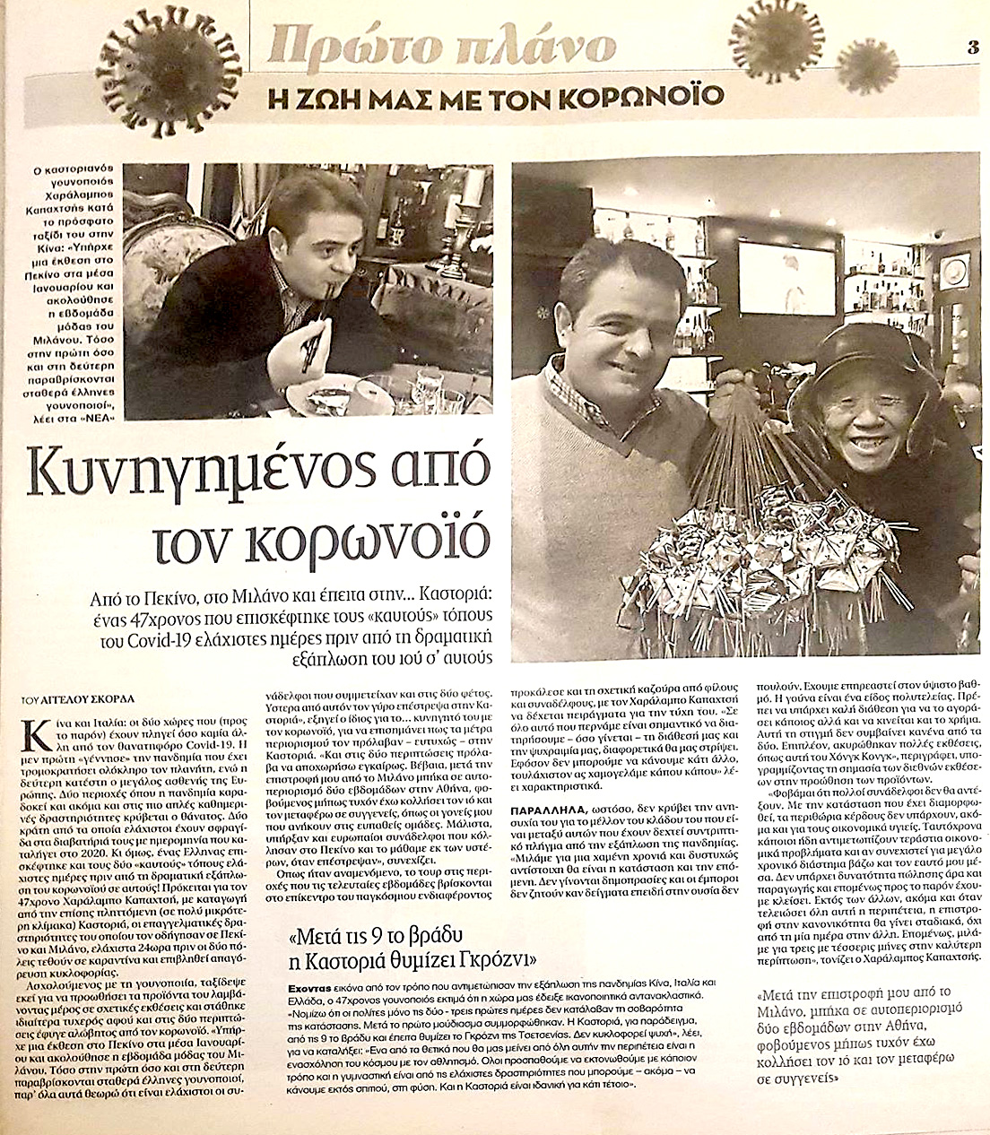 Πρόκειται για τον 47χρονο Χαράλαμπο Καπαχτσή, με καταγωγή από την επίσης πληττόμενη (σε πολύ μικρότερη κλίμακα) Καστοριά, οι επαγγελματικές δραστηριότητες του οποίου τον οδήγησαν σε Πεκίνο και Μιλάνο, ελάχιστα 24ωρα πριν οι δύο πόλεις τεθούν σε καραντίνα και επιβληθεί απαγόρευση κυκλοφορίας.