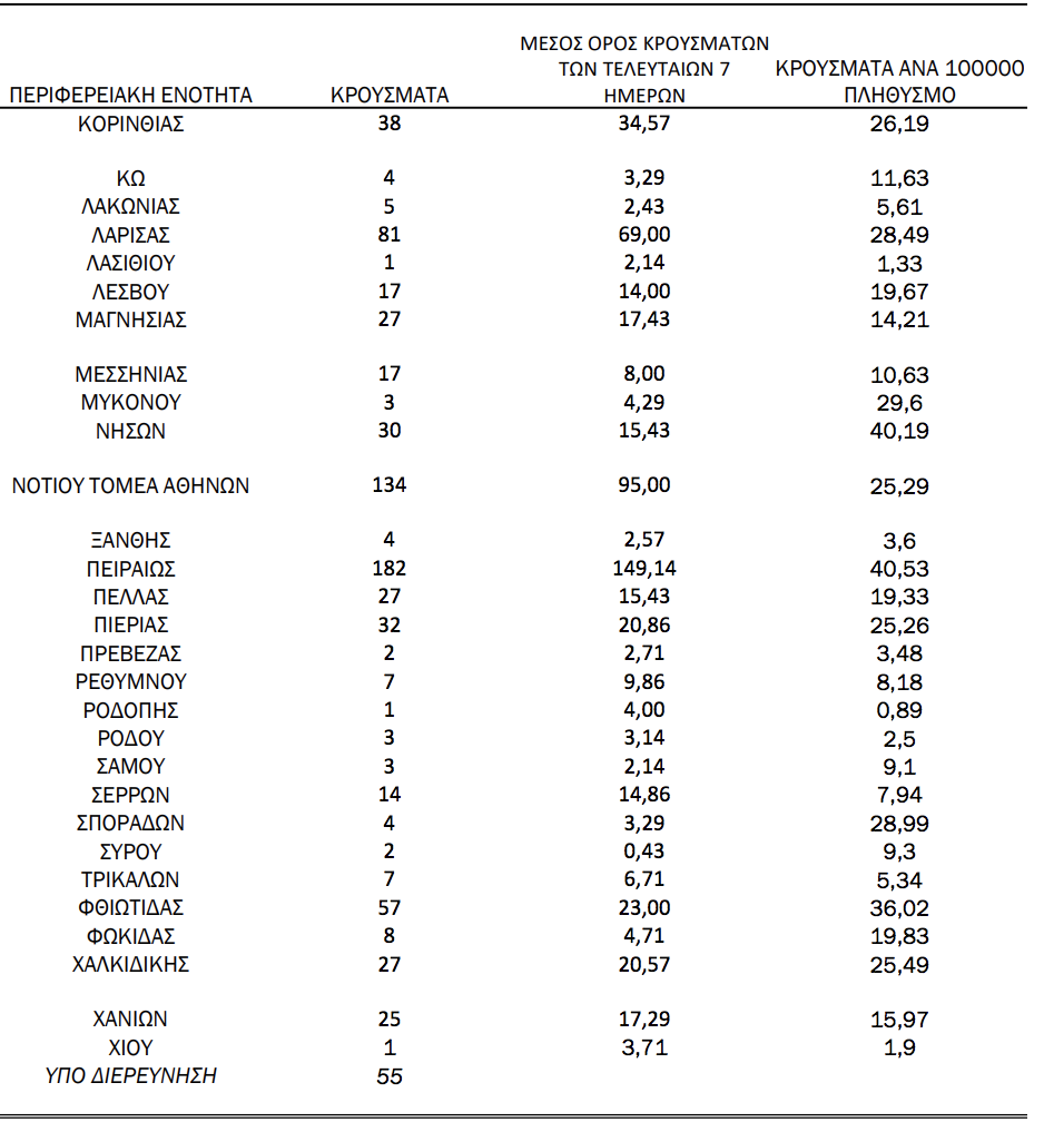 Τα νέα εργαστηριακά επιβεβαιωμένα κρούσματα της νόσου που καταγράφηκαν τις τελευταίες 24 ώρες είναι 2.512, εκ των οποίων 7 εντοπίστηκαν κατόπιν ελέγχων στις πύλες εισόδου της χώρας. Ο συνολικός αριθμός των κρουσμάτων ανέρχεται σε 219.521 (ημερήσια μεταβολή +1.2%), εκ των οποίων 51.6% άνδρες. Με βάση τα επιβεβαιωμένα κρούσματα των τελευταίων 7 ημερών, 57 θεωρούνται σχετιζόμενα με ταξίδι από το εξωτερικό και 2.082 είναι σχετιζόμενα με ήδη γνωστό κρούσμα. Οι νέοι θάνατοι ασθενών με COVID-19 είναι 52, ενώ από την έναρξη της επιδημίας έχουν καταγραφεί συνολικά 7.038 θάνατοι. Το 95.8% είχε υποκείμενο νόσημα ή/και ηλικία 70 ετών και άνω.
