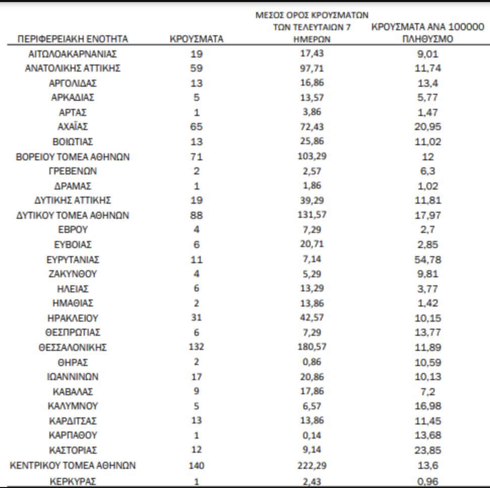 Τα νέα εργαστηριακά επιβεβαιωμένα κρούσματα της νόσου που καταγράφηκαν τις τελευταίες 24 ώρες είναι 1.134, εκ των οποίων 13 εντοπίστηκαν κατόπιν ελέγχων στις πύλες εισόδου της χώρας. Ο συνολικός αριθμός των κρουσμάτων ανέρχεται σε 222.281 (ημερήσια μεταβολή +0.5%), εκ των οποίων 51.6% άνδρες. Με βάση τα επιβεβαιωμένα κρούσματα των τελευταίων 7 ημερών, 61 θεωρούνται σχετιζόμενα με ταξίδι από το εξωτερικό και 1.744 είναι σχετιζόμενα με ήδη γνωστό κρούσμα.