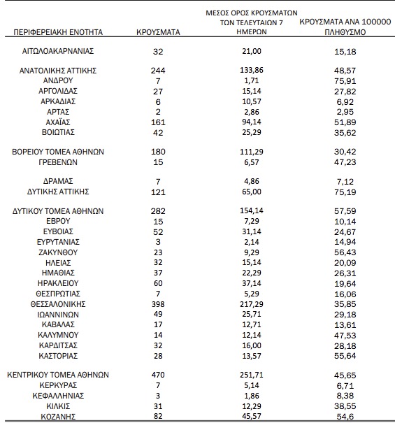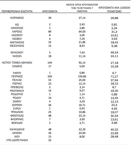 Τα νέα εργαστηριακά επιβεβαιωμένα κρούσματα της νόσου που καταγράφηκαν τις τελευταίες 24 ώρες είναι 3.586, εκ των οποίων 10 εντοπίστηκαν κατόπιν ελέγχων στις πύλες εισόδου της χώρας. Ο συνολικός αριθμός των κρουσμάτων ανέρχεται σε 242.347 (ημερήσια μεταβολή +1.5%), εκ των οποίων 51.5% άνδρες. Με βάση τα επιβεβαιωμένα κρούσματα των τελευταίων 7 ημερών, 80 θεωρούνται σχετιζόμενα με ταξίδι από το εξωτερικό και 2.965 είναι σχετιζόμενα με ήδη γνωστό κρούσμα.