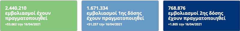 Covid-19 | Στατιστικά δεδομένα εμβολιασμού – ΤΕΛΕΥΤΑΙΑ ΕΝΗΜΕΡΩΣΗ: 16/04/2021 21:00