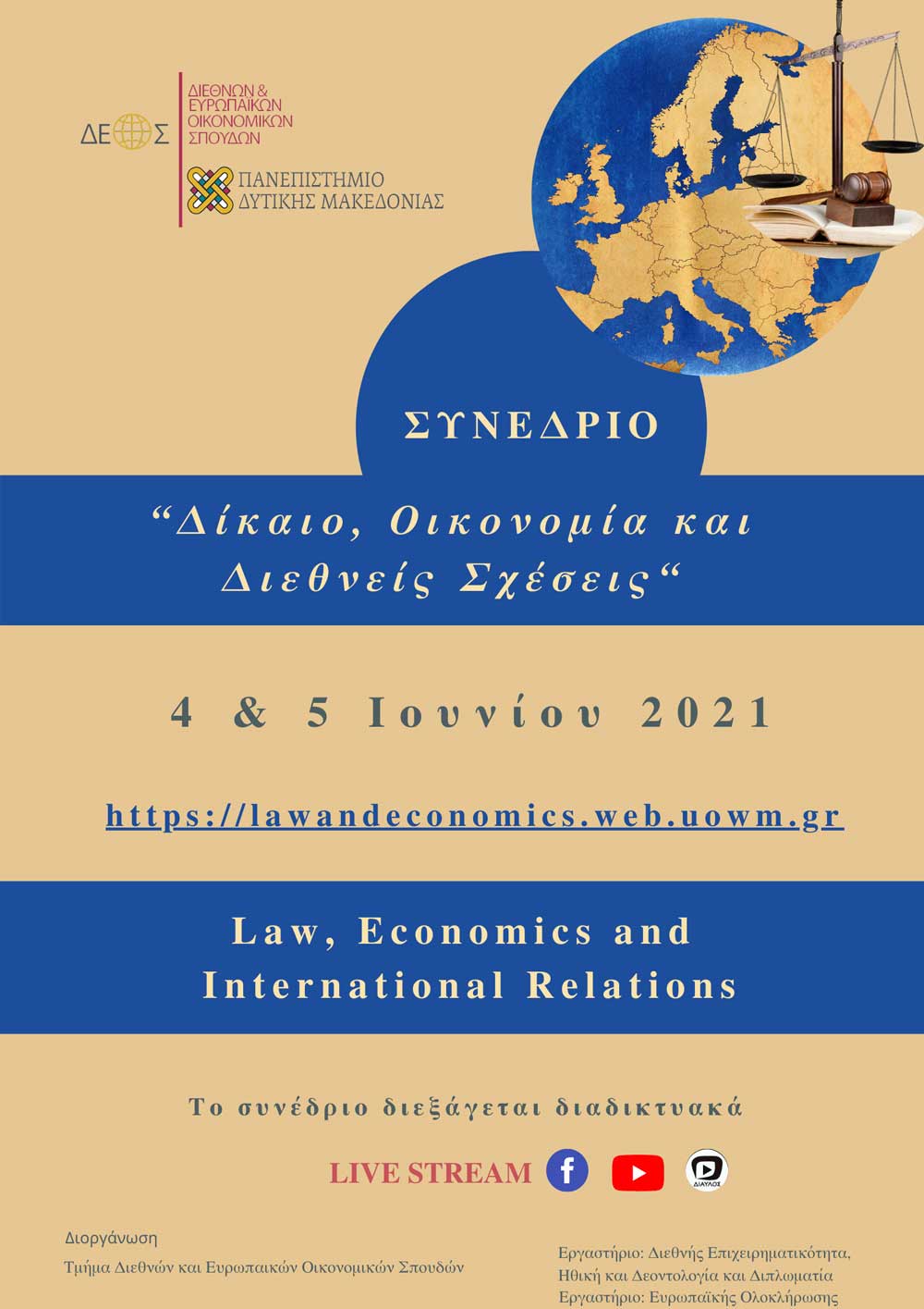 Το Τμήμα Διεθνών και Ευρωπαϊκών Οικονομικών Σπουδών (Δ.Ε.Ο.Σ.) του Πανεπιστημίου Δυτικής Μακεδονίας και τα εργαστήρια του Τμήματος “Εργαστήριο Ευρωπαϊκής Ολοκλήρωσης (Ευρωπαϊκού Επιχειρησιακού και Οικονομικού Δικαίου και Εφαρμογών Φορολογίας, Λογιστικής και Ελεγκτικής)” και “Διεθνής Επιχειρηματικότητα, Ηθική και Δεοντολογία και Διπλωματία“ διοργανώνουν, τo 1ο Πανελλήνιο Συνέδριο με θέμα “Δίκαιο, Οικονομία και Διεθνείς Σχέσεις”.
