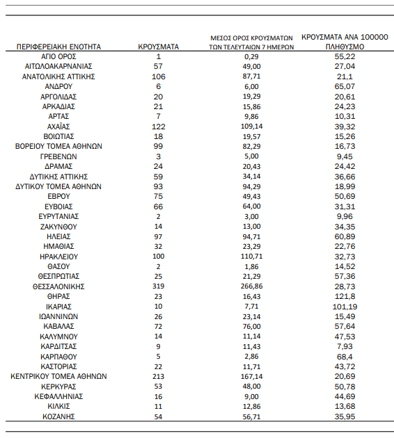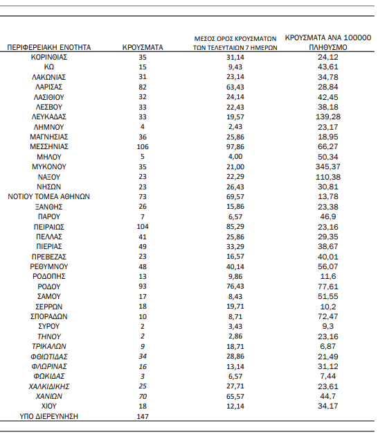 Η κατανομή των 3.237 νέων εγχώριων κρουσμάτων ανά Περιφερειακή Ενότητα παρουσιάζεται στον κατωτέρω πίνακα.