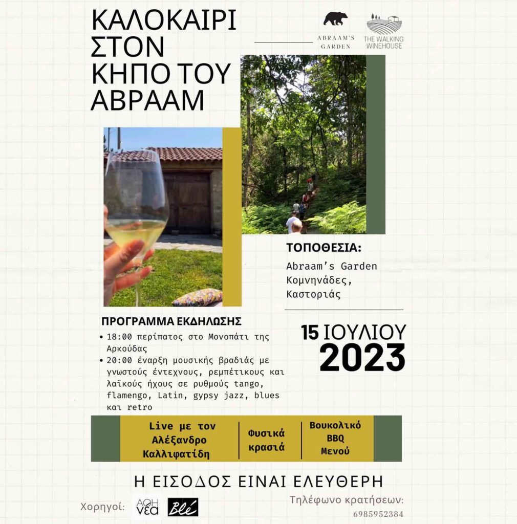 Με μία σειρά τριών εκδηλώσεων γεμάτες μουσική, κρασί και βόλτες στα αμπέλια του “Παππού Αβραάμ” και το “μονοπάτι της αρκούδας” γιορτάζεται το καλοκαίρι 2023 στις Κομνηνάδες Καστοριάς.