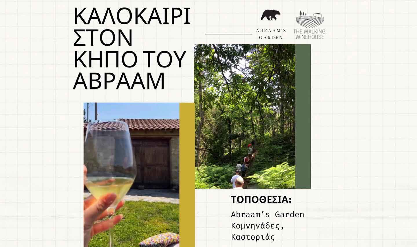 18.00: Bόλτα στο νεοσύστατο “μονοπάτι της Αρκούδας” το οποίο οδηγεί στον βιολογικό αμπελώνα του “Παππού Αβραάμ”, ο οποίος είναι ένας από τους ομορφότερους και υψηλότερους αμπελώνες της Ευρώπης. Η βόλτα θα γίνει στα πλαίσια του “Walking Winehouse” και ουσιαστικά θα εγκαινιάσει το μονοπάτι. Σημείο εκκίνησης η Αυλή του Αβραάμ.