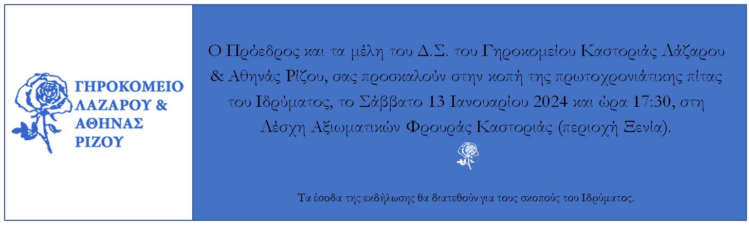 Ο Πρόεδρος και τα μέλη του Δ.Σ. του Γηροκομείου Καστοριάς Λάζαρου & Αθηνάς Ρίζου, σας προσκαλούν στην κοπή της πρωτοχρονιάτικης πίτας του Ιδρύματος, το Σάββατο 13 Ιανουαρίου 2024 και ώρα 17:30, στη Λέσχη Αξιωματικών Φρουράς Καστοριάς (περιοχή Ξενία).