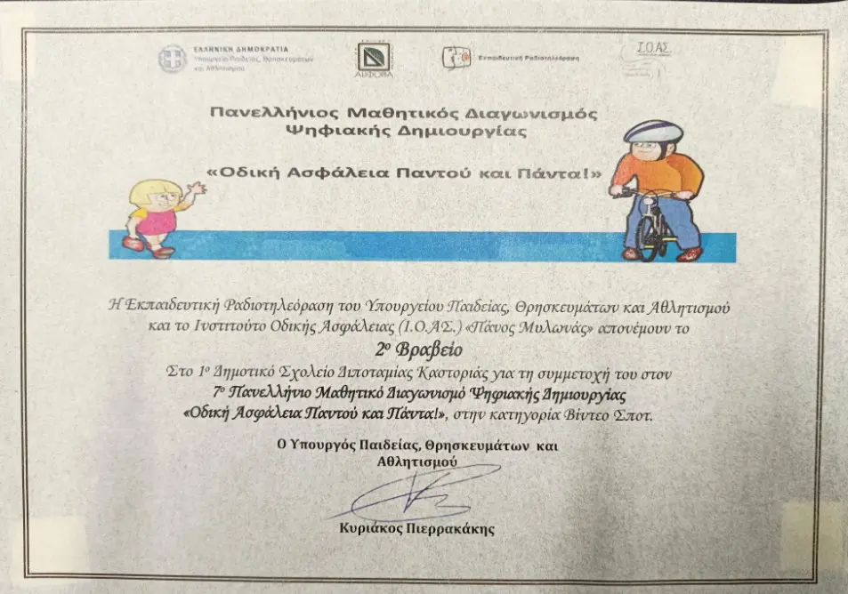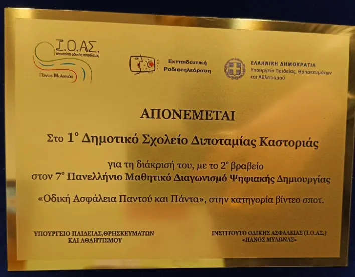 Οι μαθητές και οι μαθήτριες του Δημοτικού Σχολείου Διποταμίας, συνοδευόμενοι από τη δασκάλα τους κ. Κατερίνα Στεφανάκου, συμμετείχαν στην τελετή βράβευσης στην Αθήνα για τη διάκρισή τους στον 7ο Πανελλήνιο Μαθητικό Διαγωνισμό Ψηφιακής Δημιουργίας «Οδική Ασφάλεια Παντού και Πάντα!» αποσπώντας το 2ο βραβείο.
