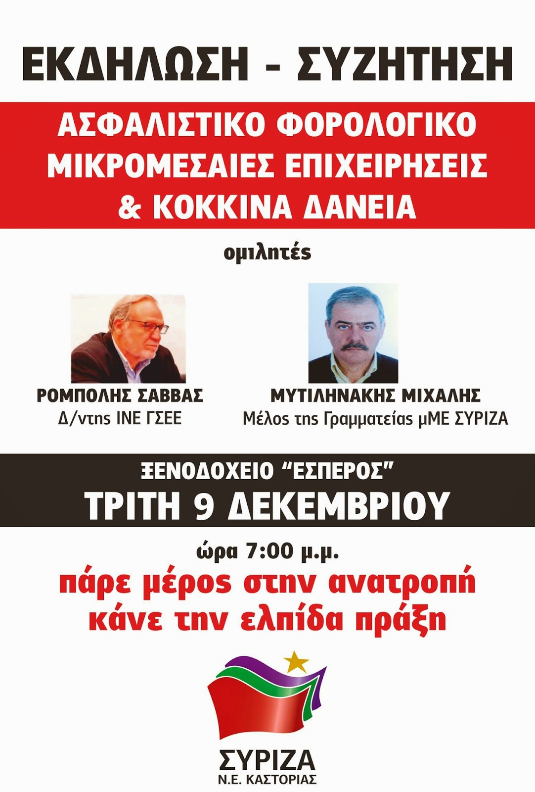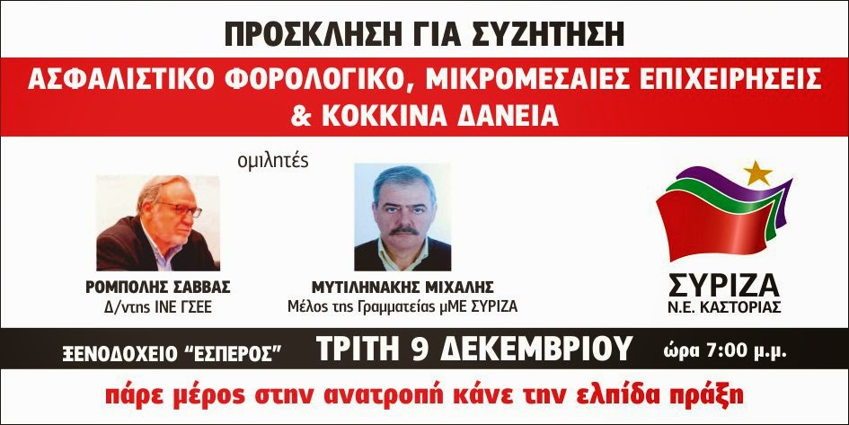 Ν.Ε. ΣΥΡΙΖΑ ΚΑΣΤΟΡΙΑΣ:ΠΡΟΣΚΛΗΣΗ ΓΙΑ ΣΥΖΗΤΗΣΗ -ΑΣΦΑΛΙΣΤΙΚΟ ΦΟΡΟΛΟΓΙΚΟ, ΜΜΕ ΚΑΙ ΚΟΚΚΙΝΑ ΔΑΝΕΙΑ
